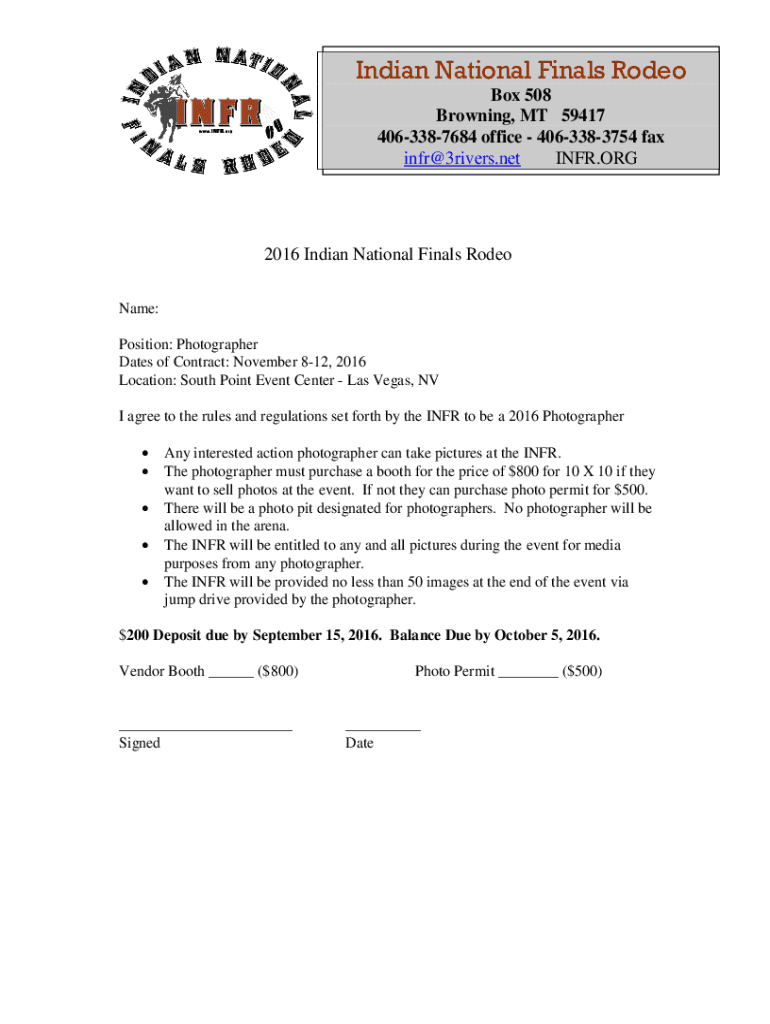 Indian National Finals Rodeo Box 508 Browning, MT 59417 4063387684 office 4063383754 fax infer 3rivers.net INFER.ORG2016 Indian National Finals Rodeo Name: Position: Photographer Dates of Contract: