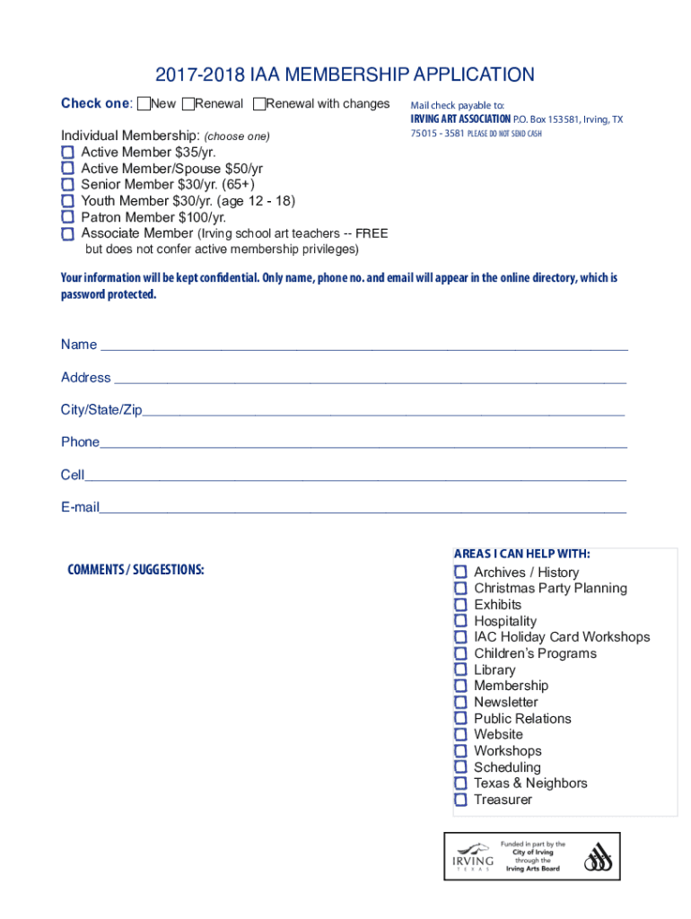 20172018 IAA MEMBERSHIP APPLICATION Check one: New Renewal with changesMail check payable to:IRVING ART ASSOCIATION P.O. Box 153581, Irving, Individual Membership: (choose one) Active Member $35/yr.