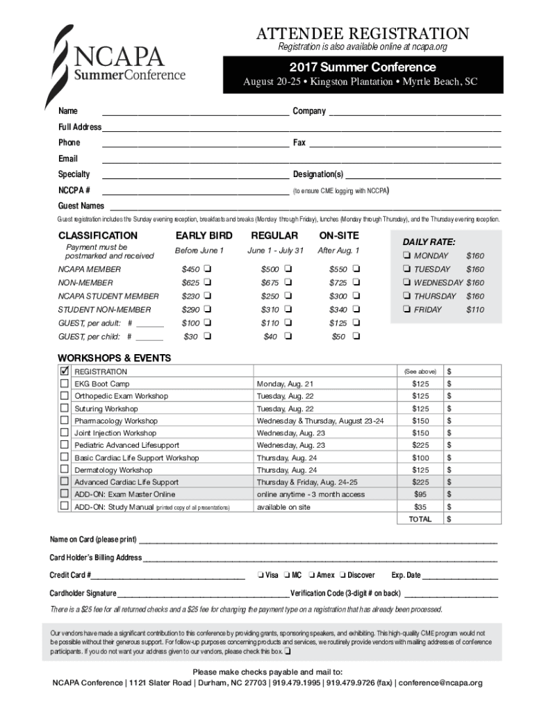 ATTENDEE REGISTRATION is also available online at NCAA.org2017 Summer Conference August 2025 Kingston Plantation Myrtle Beach, SC Name Company Full Address Phone Fax Email Specialty Designation(s)