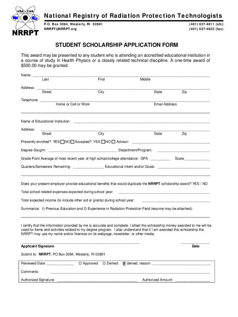National Registry of Radiation Protection Technologists P.O. Box 3084, Westerly, RI 02891 NR RPT.org(401) 6374811 (of) (401) 6374822 (fax)STUDENT SCHOLARSHIP APPLICATION From This award may be presented