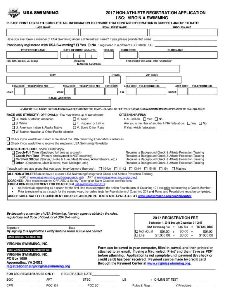 USA SWIMMING2017 NONATHLETIC REGISTRATION APPLICATION LSC: VIRGINIA SWIMMINGPLEASE PRINT LEGIBLY COMPLETE ALL INFORMATION TO ENSURE THAT CONTACT INFORMATION IS CORRECT AND UP TO DATE: LAST NAMELESS