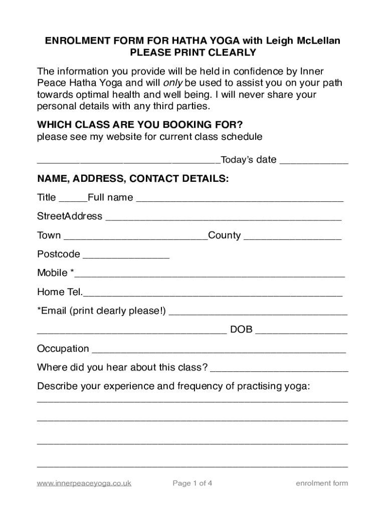 Anyone interested in joining a hatha yoga class needs to fill out the enrolment form. Whether you are a beginner or have previous experience, the form helps the yoga center organize class schedules, understand any special needs or health concerns, and maintain proper records for their students. It is important to provide accurate information on the enrolment form to ensure a safe and satisfactory yoga experience.