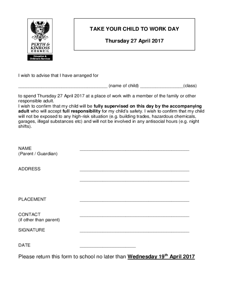 TAKE YOUR CHILD TO WORK DAY Thursday 27 April 2017I wish to advise that I have arranged for (name of child) (class) to spend Thursday 27 April 2017 at a place of work with a member of the family or
