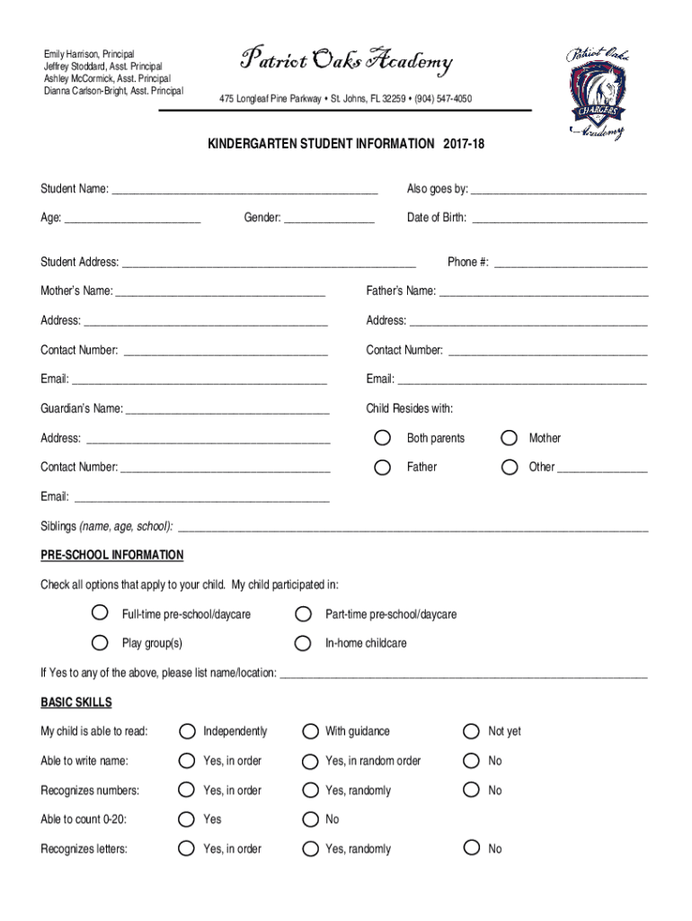 Get the free Kindergarten Student Info form 2017-18 - www-poa stjohns k12 fl
