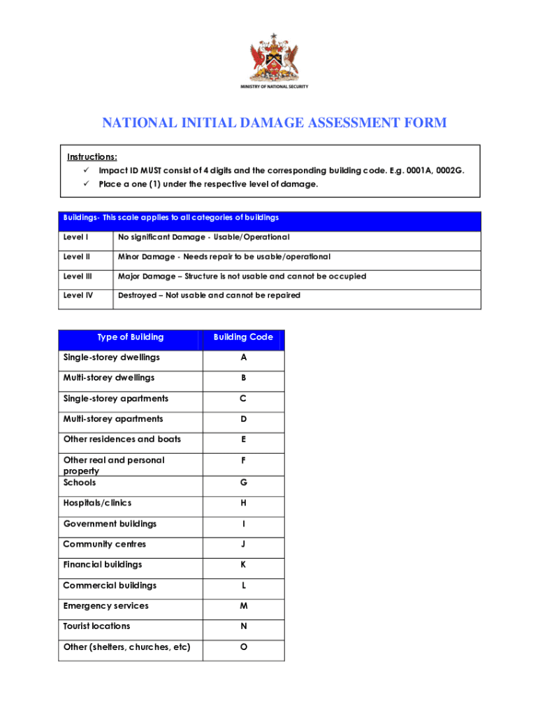 NATIONAL INITIAL DAMAGE ASSESSMENT FORM Instructions: Impact ID MUST consist of 4 digits and the corresponding building code. E.g. 0001A, 0002G. Place a one (1) under the respective level of damage.
