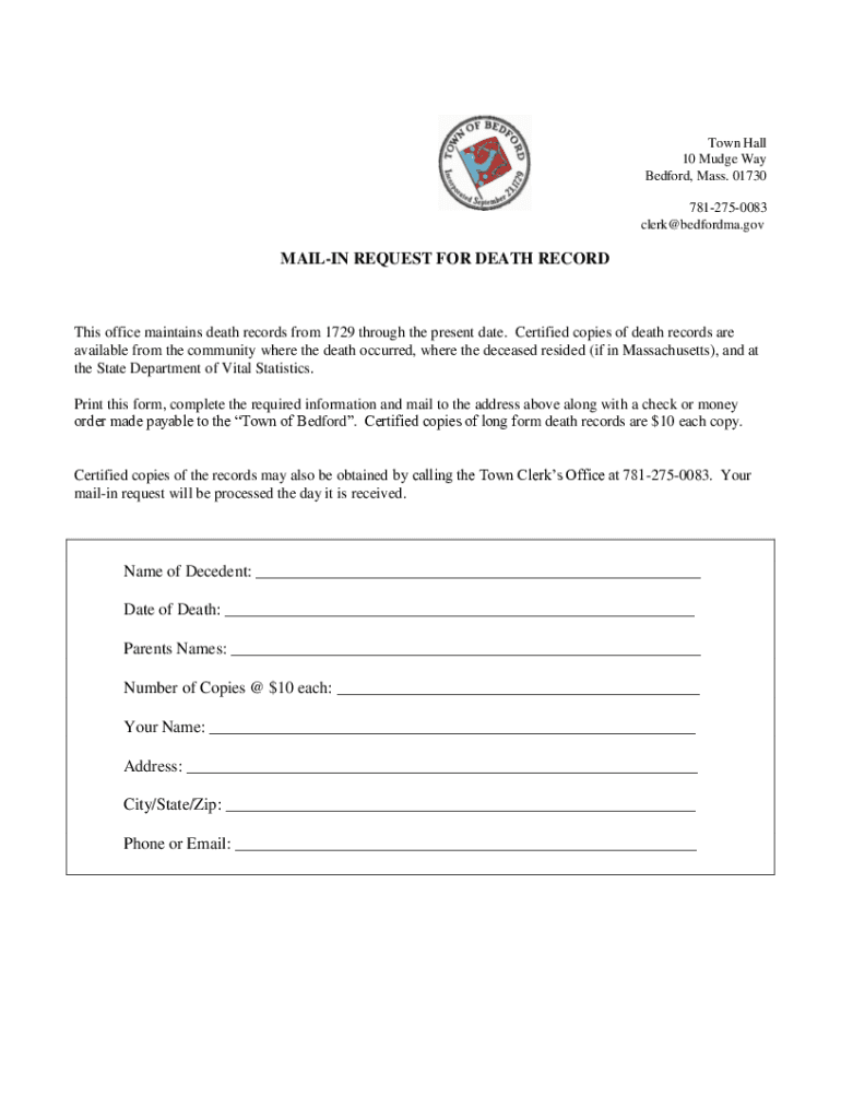 clerk@bedfordma.govMAILIN REQUEST FOR DEATH Records office maintains death records from 1729 through the present date. Certified copies of death