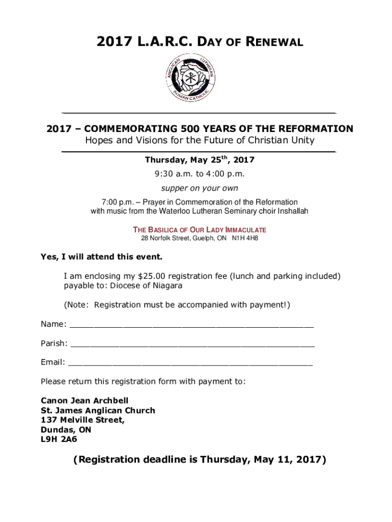 2017 L.A.R.C. DAY OF RENEWAL2017 COMMEMORATING 500 YEARS OF THE REFORMATION Hopes and Visions for the Future of Christian Unity Thursday, May 25th, 2017 9:30 a.m. to 4:00 p.m. supper on your own 7:00