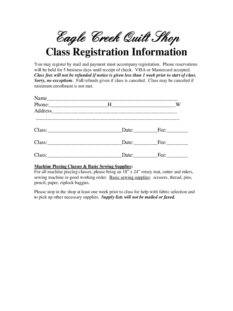 Class Registration Information You may register by mail and payment must accompany registration. Phone reservations will be held for 5 business days until receipt of check. VISA or Mastercard accepted.