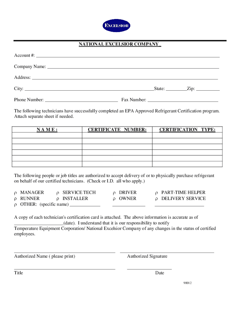 NATIONAL EXCELSIOR COMPANY Account #: Company Name: Address: City: State: Zip: Phone Number: Fax Number: The following technicians have successfully completed an EPA Approved Refrigerant Certification