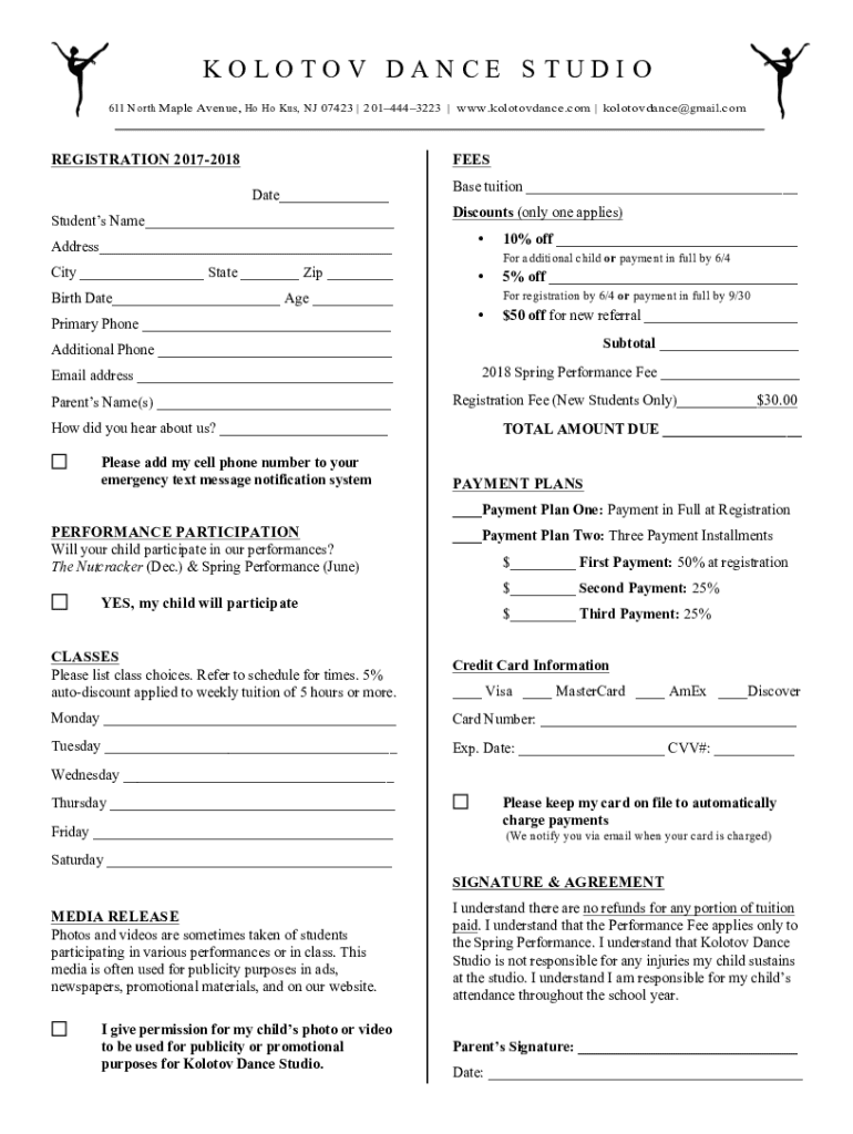 KO LO TO V D A N CE S TU D I O 611 North Maple Avenue, Ho Ho Us, NJ 07423 2014443223 www.kolotovdance.com kolotovdance Gmail. Registration 20172018FEES Date Students Name Base tuition Discounts (only