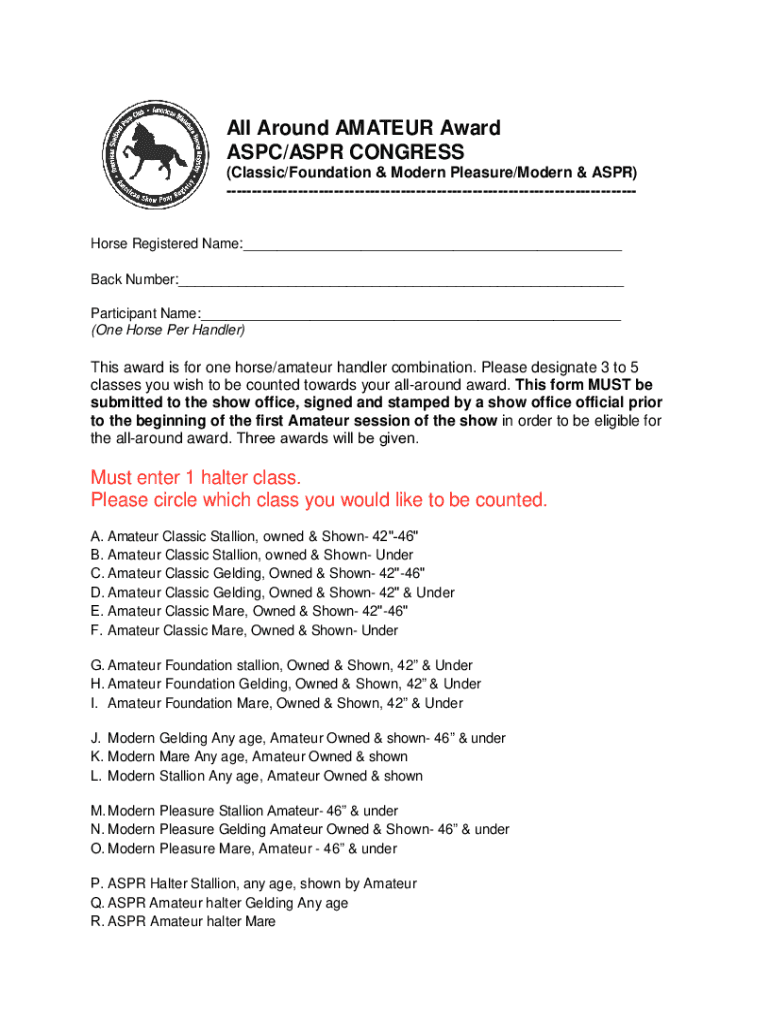 All Around AMATEUR Award APC/ASPR CONGRESS(Classic/Foundation & Modern Pleasure/Modern & ASPR) Horse Registered Name: Back Number: Participant Name: (One Horse Per Handler)This award is for one horse/amateur