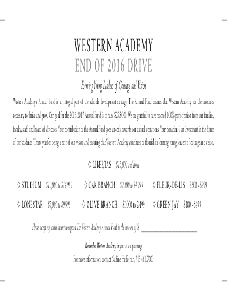 Forming Young Leaders of Courage and Vision Western Academies Annual Fund is an integral part of the schools' development strategy. The Annual Fund ensures