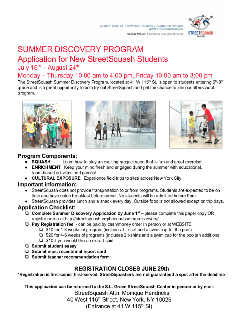 SUMMER DISCOVERY PROGRAM Application for New Street Squash Students July 16th August 24th Monday Thursday 10:00 am to 4:00 pm, Friday 10:00 am to 3:00 pm The Street Squash Summer Discovery Program,