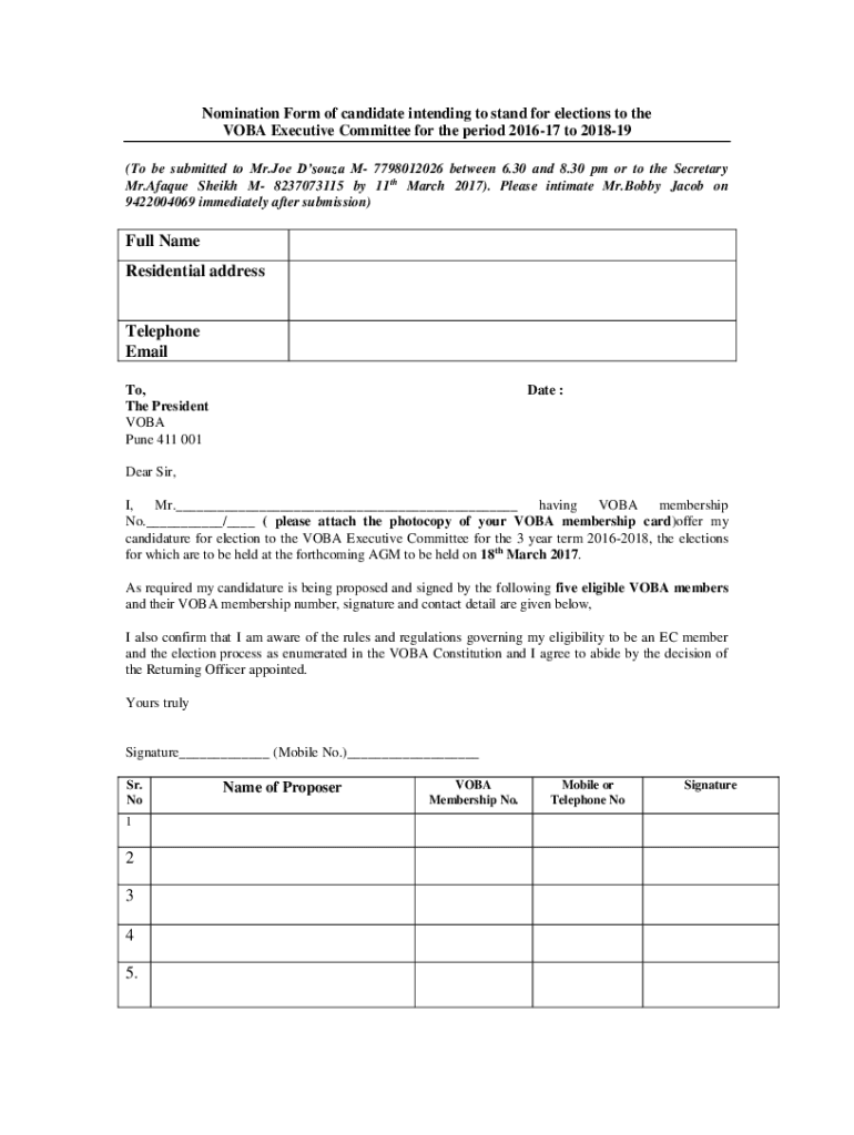 Nomination Form of candidate intending to stand for elections to the VOA Executive Committee for the period 201617 to 201819 (To be submitted to Mr. Joe Souza M 7798012026 between 6.30 and 8.30 pm