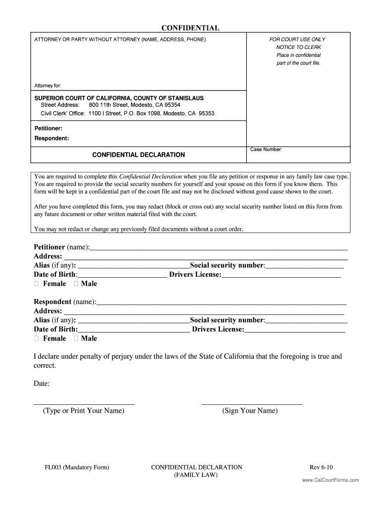 The Confidential Declaration Form is intended for petitioners and respondents involved in family law cases in California. Both parties must complete and sign the form as part of the legal process.