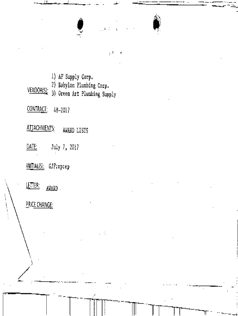 ..., J JIM IL J. 1) AF Supply Corp.VENDOR(S):2) Babylon Plumbing Corp.3) Green Art Plumbing SupplyCONTRACT:48201 7ATTACHMENTS: DATE: INITIAL(S): LETTER: AWARD LISTS July 7, 2017, GDF:NP :EP AWARDPRICE