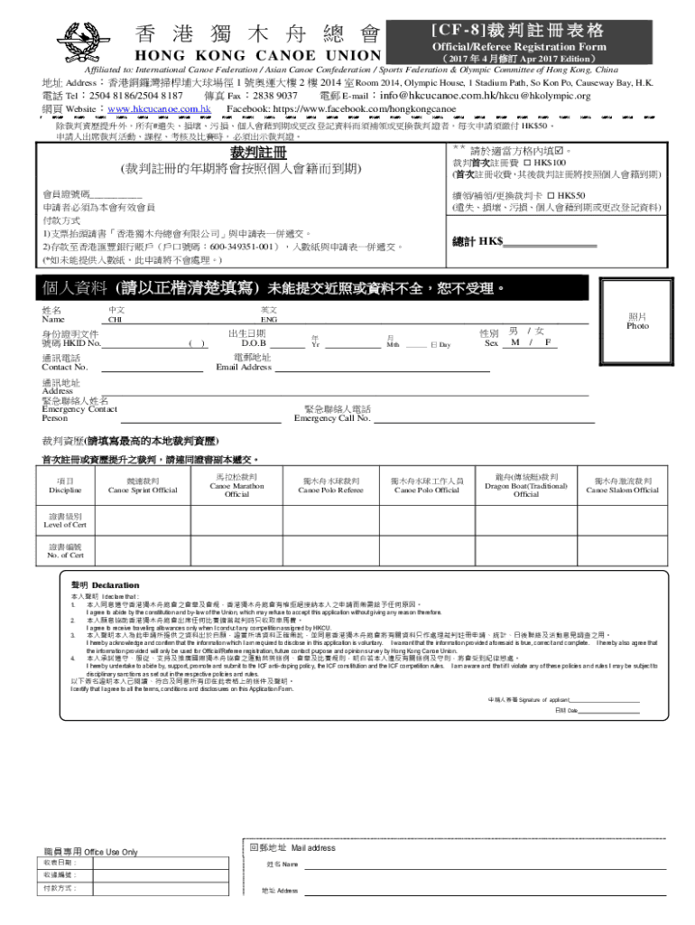 CF 8 Official/Referee Registration Forming KONG CANOE UNION2017 4 Apr 2017 Edition Affiliated to: International Canoe Federation / Asian Canoe Confederation / Sports Federation & Olympic Committee