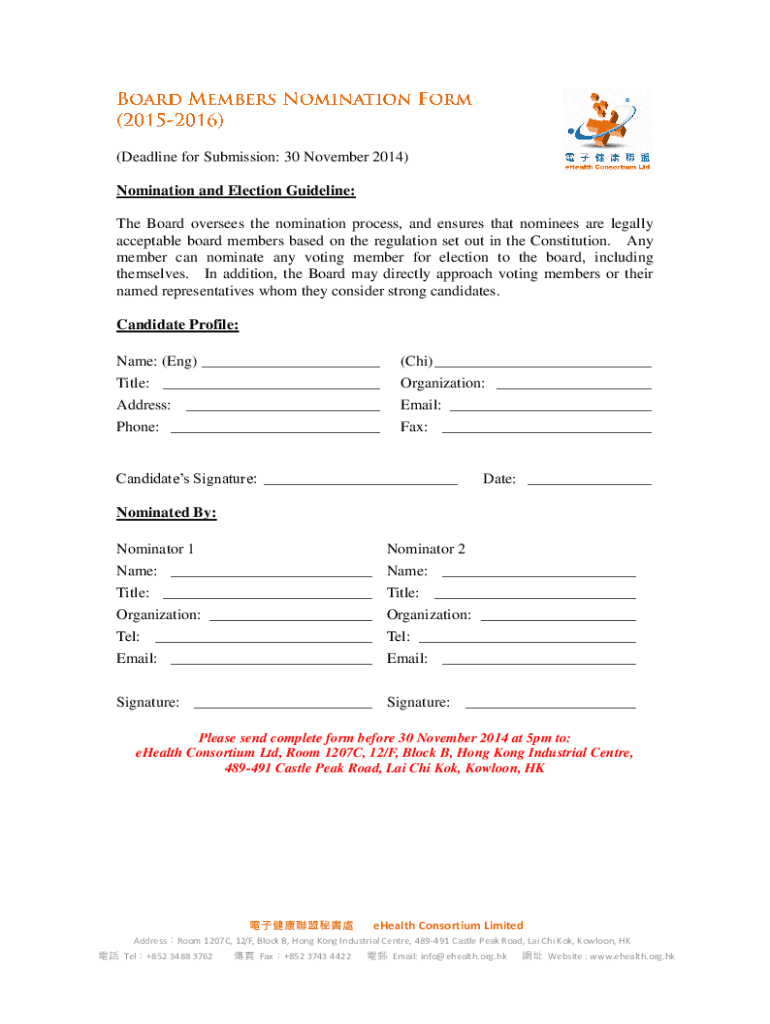 (Deadline for Submission: 30 November 2014) Nomination and Election Guideline: The Board oversees the nomination process, and ensures that nominees are legally acceptable board members based on the