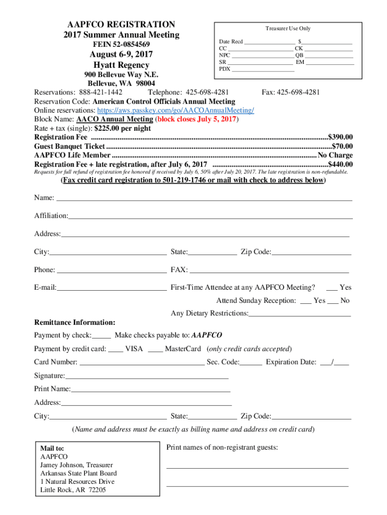 AAP FCO REGISTRATION 2017 Summer Annual Meeting VEIN 520854569August 69, 2017 Hyatt RegencyTreasurer Use Only Date Recd $ CC CK NPC QB SR EM PDX 900 Bellevue Way N.E. Bellevue, WA 98004 Reservations: