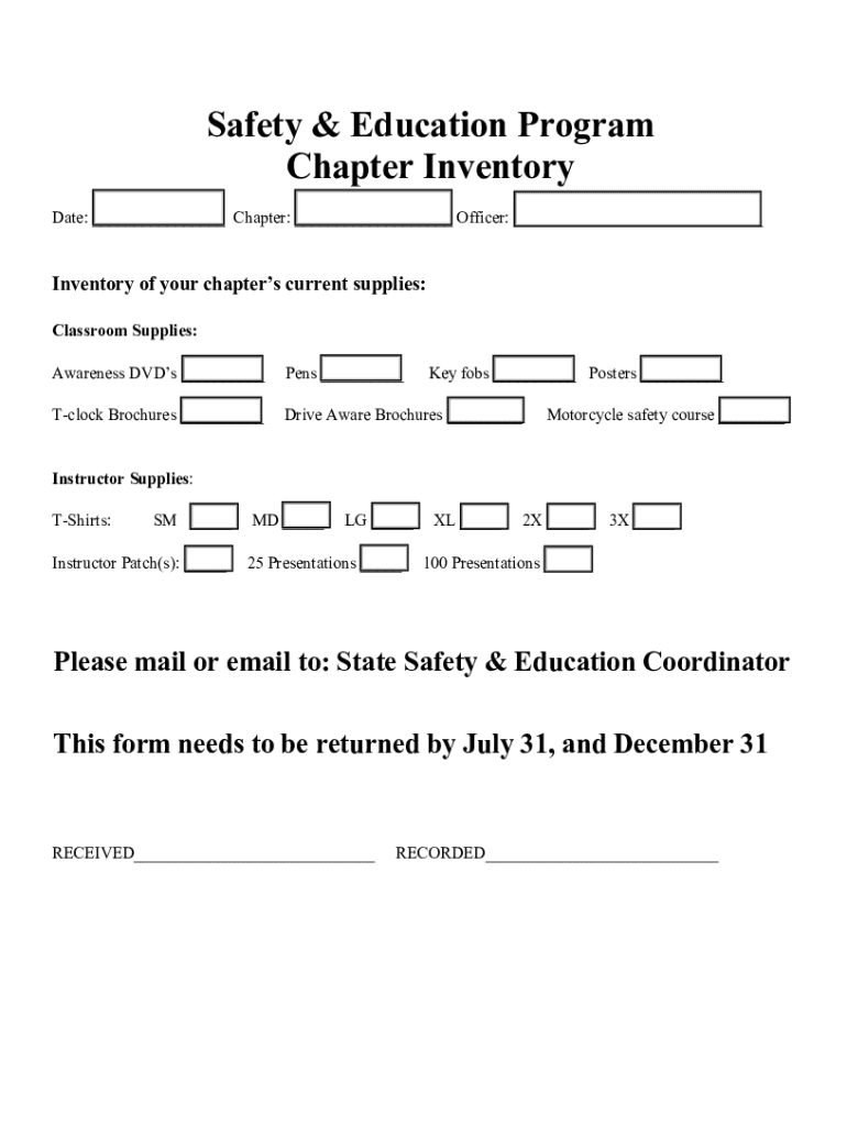 Safety & Education Program Chapter Inventory Date: Chapter: Officer: Inventory of your chapters current supplies: Classroom Supplies: Awareness DVDs Pens Key fobs Posters Clock Brochures Drive Aware