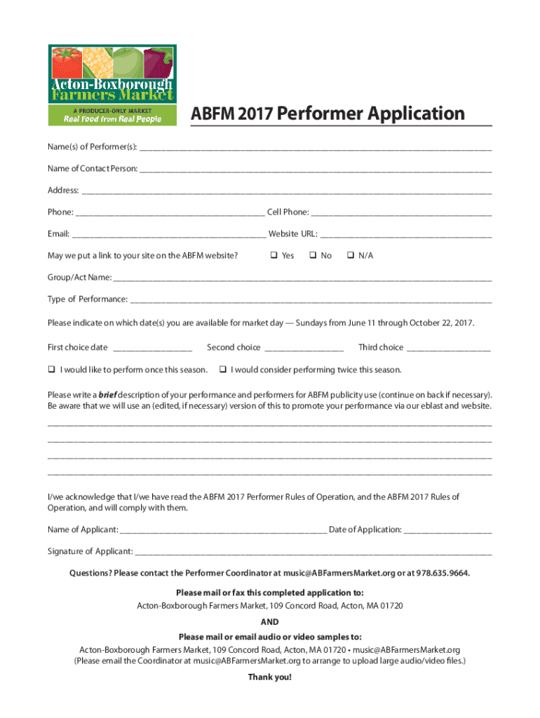 ABM 2017 Performer Application Name(s) of Performer(s): Name of Contact Person: Address: Phone: Cell Phone: Email: Website URL: May we put a link to your site on the ABM website?q Yes Not N/Group/Act