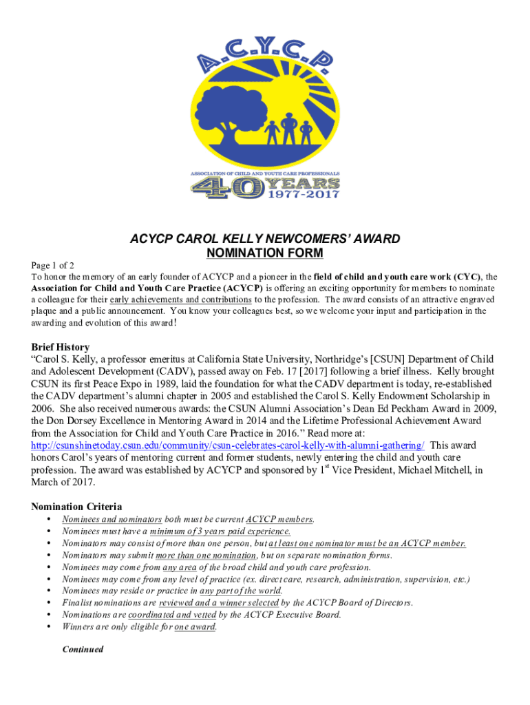 Get the free ACYCP CAROL KELLY NEWCOMERS AWARD NOMINATION FORM