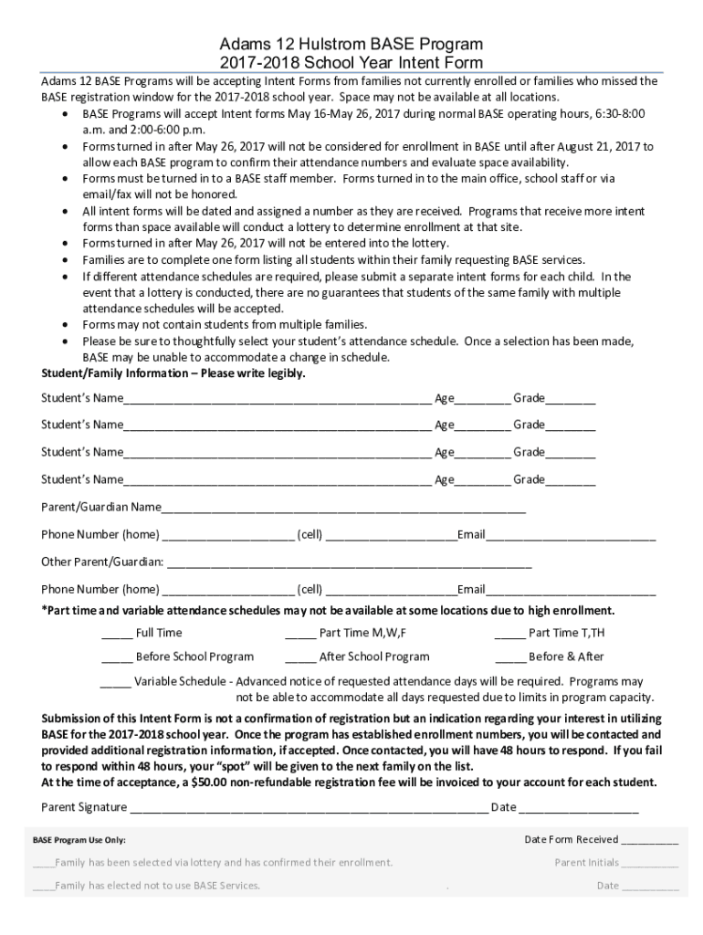 Get the free Adams 12 Hulstrom BASE Program 2017-2018 School Year Intent Form