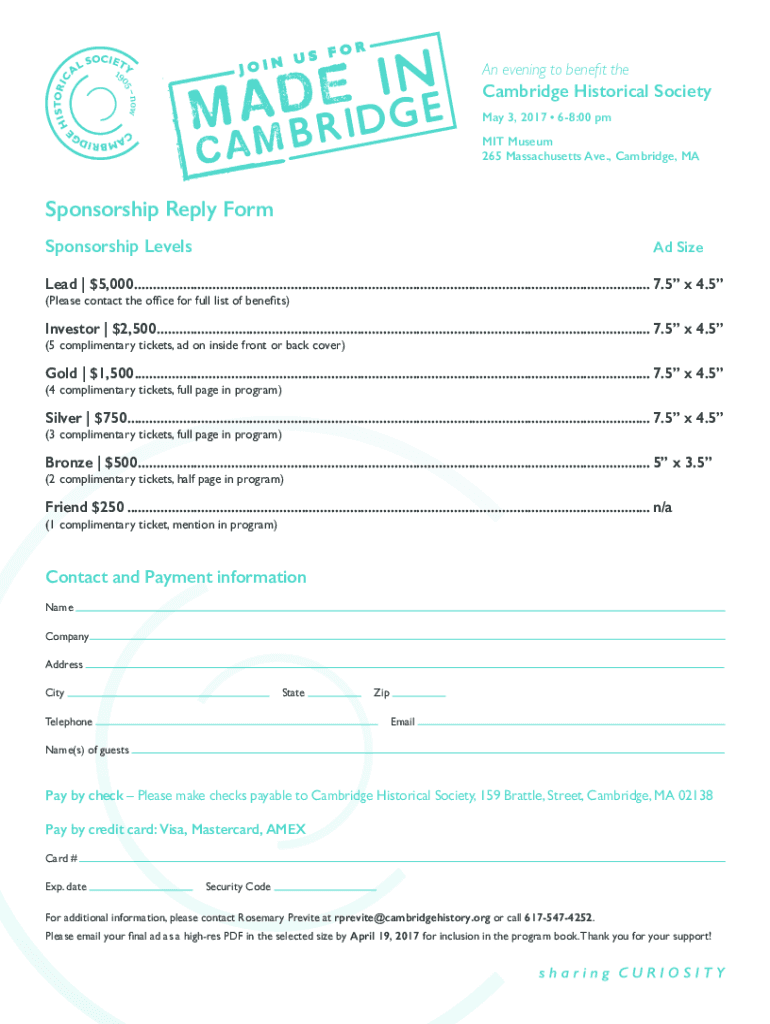 An evening to benefit the Cambridge Historical Society May 3, 2017 68:00 pm MIT Museum 265 Massachusetts Ave., Cambridge, Sponsorship Reply Form Sponsorship Levels Sizzled $5,000............................................................................................................................................
