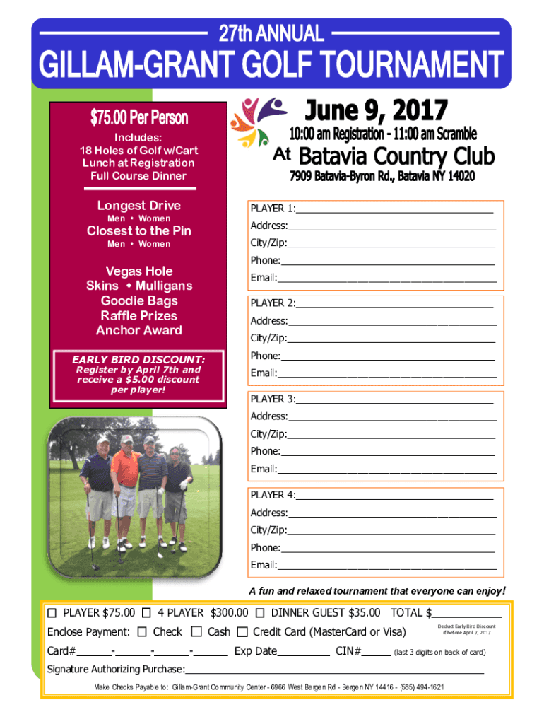 Includes: 18 Holes of Golf w/Cart Lunch at Registration Full Course DinnerLongest Driveler 1: Closest to Misaddress: Men Women Vegas Hole Skins Mulligans Goodie Bags Raffle Prizes Anchor Award EARLY