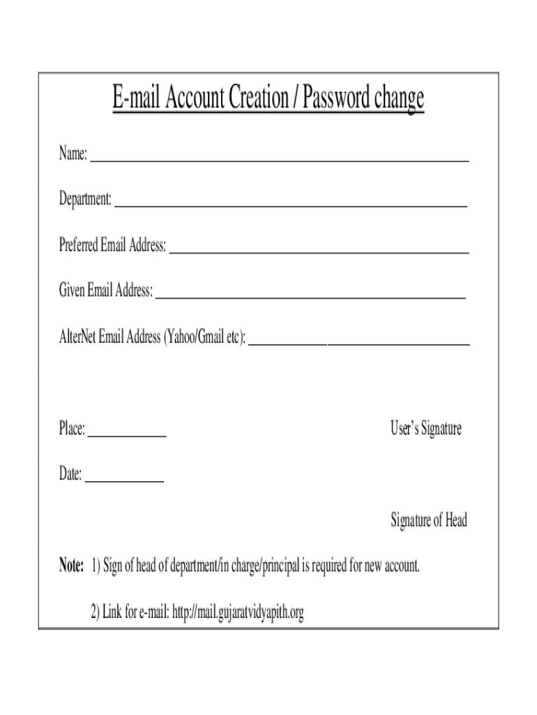 Email Account Creation / Password change Name: Department: Preferred Email Address: Given Email Address: Internet Email Address (Yahoo/Gmail etc): Place: Users SignatureDate: Signature of headnote: