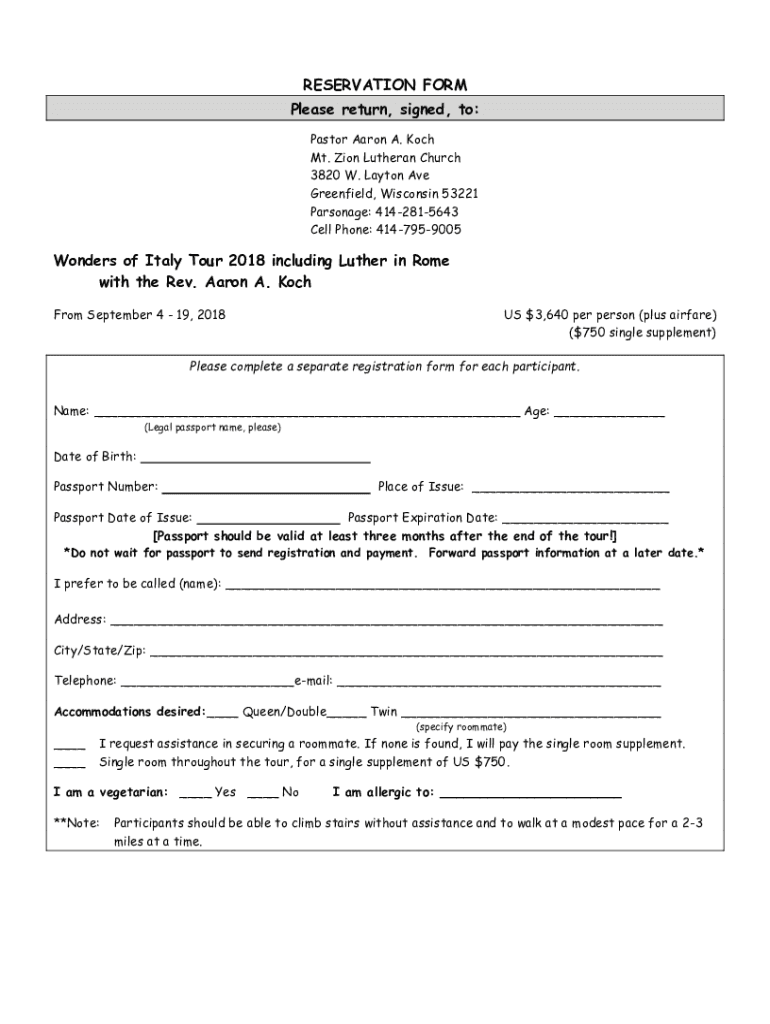 RESERVATION FORM Please return, signed, to: Pastor Aaron A. Koch Mt. Zion Lutheran Church 3820 W. Layton Ave Greenfield, Wisconsin 53221 Parsonage: 4142815643 Cell Phone: 4147959005Wonders of Italy