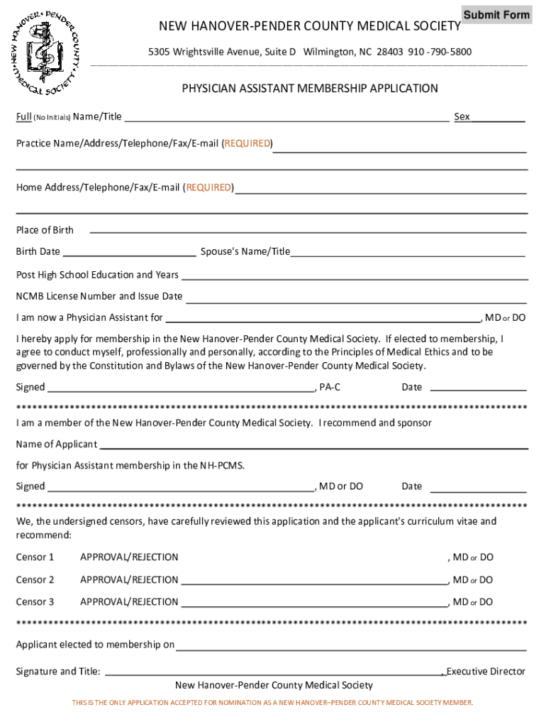NEW HANOVERPENDER COUNTY MEDICAL SOCIETYSubmit Form5305 Wrightsville Avenue, Suite D Wilmington, NC 28403 9107905800 PHYSICIAN ASSISTANT MEMBERSHIP APPLICATION Full (No Initials) Name/Title Sex Practice