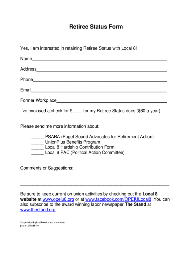 Retiree Status Former, I am interested in retaining Retiree Status with Local 8! Name Address Phone Email Former Workplace I've enclosed a check for $ for my Retiree Status dues ($60 a year). Please