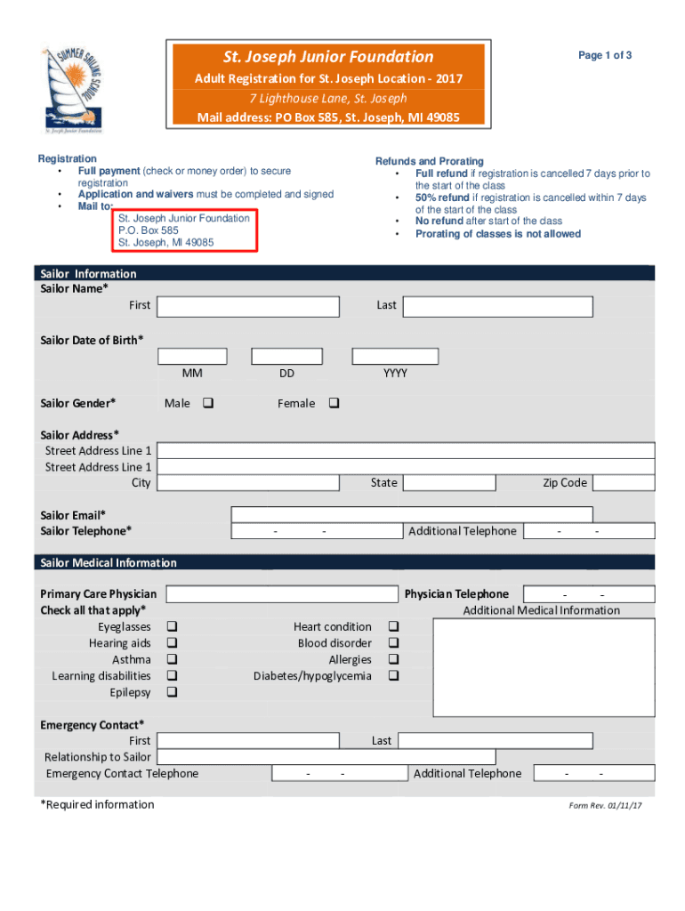 St. Joseph Junior Foundation Page 1 of 3Adult Registration for St. Joseph Location 2017 7 Lighthouse Lane, St. Joseph Mail address: PO Box 585, St. Joseph, MI 49085 Registration Full payment (check