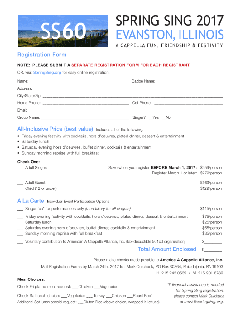 SPRING SING 2017SS60EVANSTON, ILLINOIS A CAPPELLA FUN, FRIENDSHIP & FESTIVITYRegistration Form NOTE: PLEASE SUBMIT A SEPARATE REGISTRATION FORM FOR EACH REGISTRANT. OR, visit Springing.org for easy