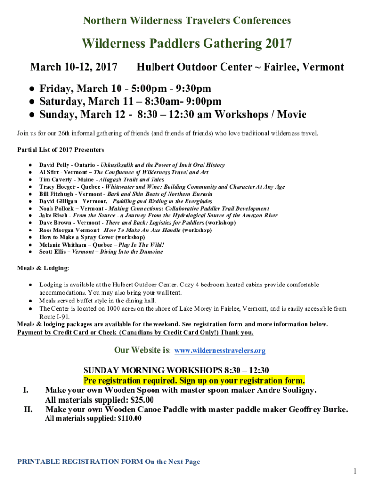 Northern Wilderness Travelers ConferencesWilderness Paddlers Gathering 2017 March 1012, 2017Hulbert Outdoor Center Fair lee, Vermont Friday, March 10 5:00pm 9:30pm Saturday, March 11 8:30am 9:00pm