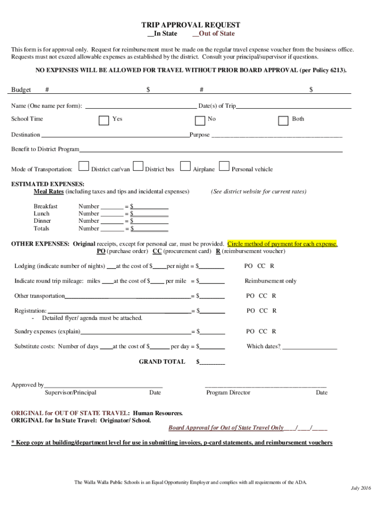 TRIP APPROVAL REQUEST In State Out of States form is for approval only. Request for reimbursement must be made on the regular travel expense voucher from the business office. Requests must not exceed