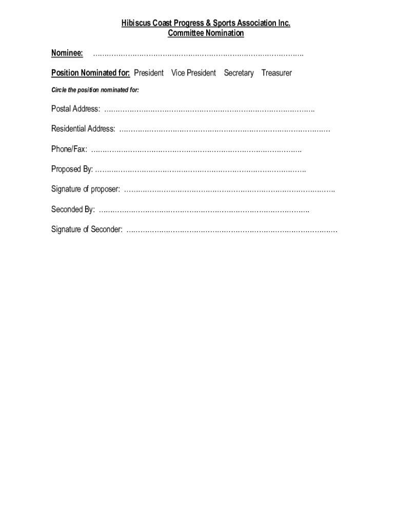 Hibiscus Coast Progress & Sports Association Inc. Committee Nomination Nominee:. Position Nominated for: President Vice President Secretary Treasurer Circle the position nominated for:Postal Address:.