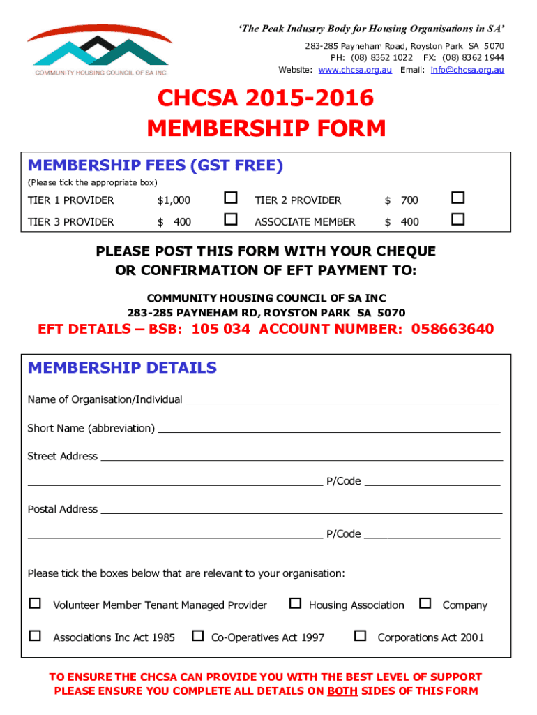 Get the free The Community Housing Council of South Australia Inc. - chcsa org