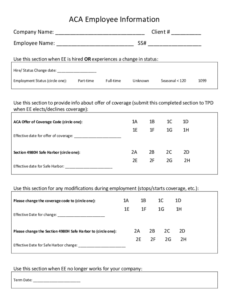 ACA Employee Information Company Name: Client # Employee Name: SS# Use this section when EE is hired OR experiences a change in status: Hire/ Status Change date: Employment Status (circle one):ParttimeFulltimeUnknownSeasonal