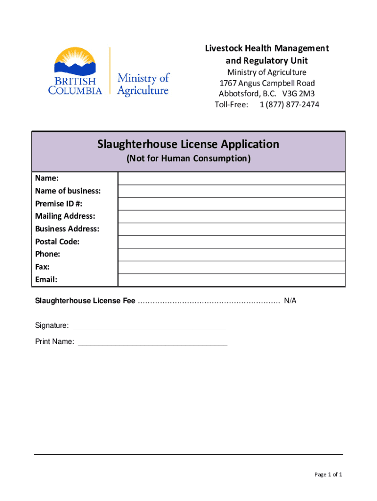 Livestock Health Management and Regulatory Unit Ministry of Agriculture 1767 Angus Campbell Road Abbotsford, B.C. V3G 2M3 Toll-free: 1 (877) 8772474Slaughterhouse License Application (Not for Human