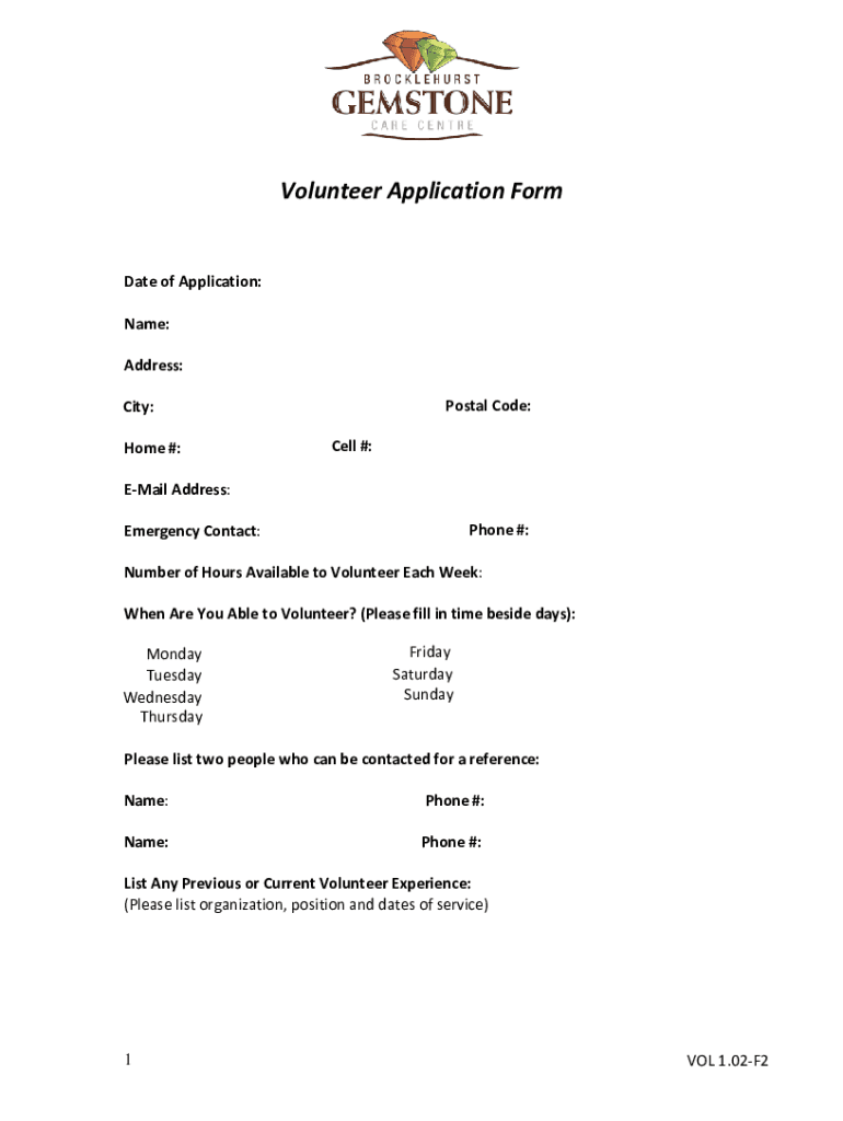 Phone #:Emergency Contact:Number of Hours Available to Volunteer Each Week:
