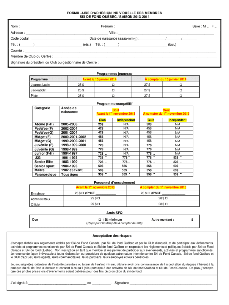 FORMULA IRE ADHESION INDIVIDUALLY DES MEMBER SKI DE FOND QUEBEC / SAIGON 20132014 Not : Prom : See : Madness : Villa : Code postal : Date de Renaissance (aaaammjj) : / / Tl. : () (rs.) Tl. : () (bur.)