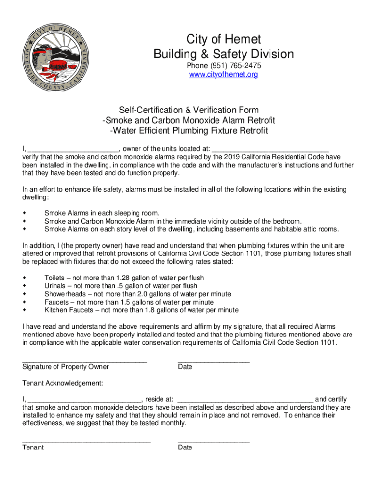 City of Hemet Building & Safety Division Phone (951) 7652475 www.cityofhemet.orgSelfCertification & Verification Form Smoke and Carbon Monoxide Alarm Retrofit Water Efficient Plumbing Fixture Retrofit