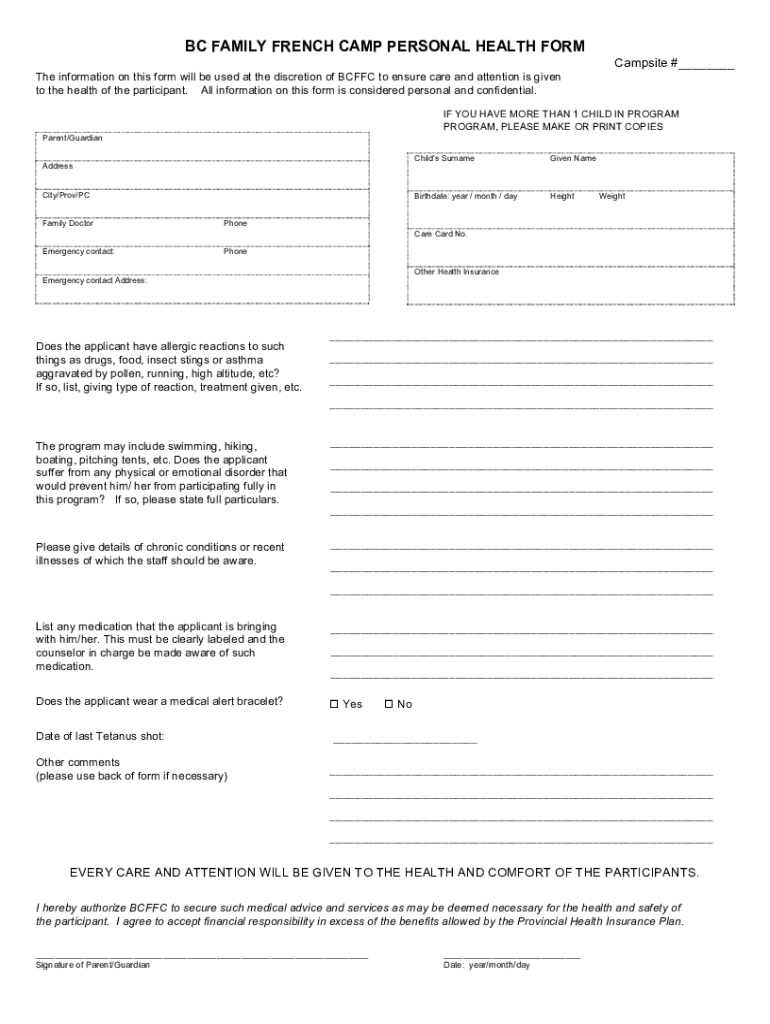 BC FAMILY FRENCH CAMP PERSONAL HEALTH FORM Campsite # The information on this form will be used at the discretion of BCF FC to ensure care and attention is given to the health of the participant.
