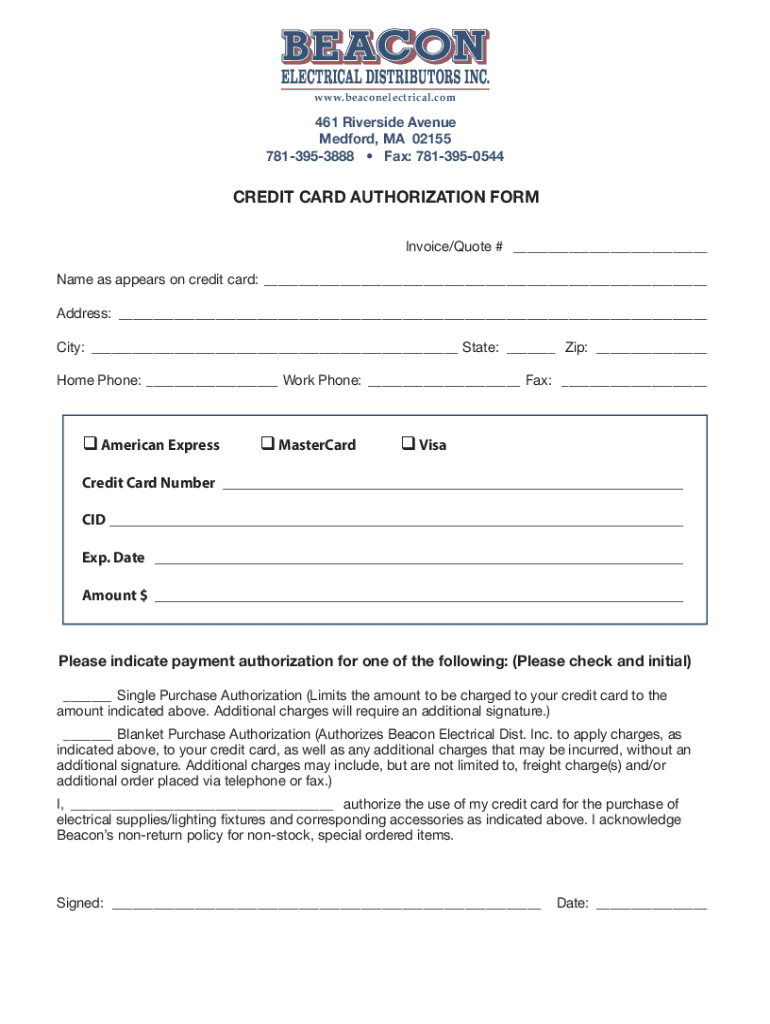WWW.beacon electrical.com461 Riverside Avenue Medford, MA 02155 7813953888 Fax: 7813950544CREDIT CARD AUTHORIZATION FORM Invoice/Quote # Name as appears on credit card: Address: City: State: Zip: