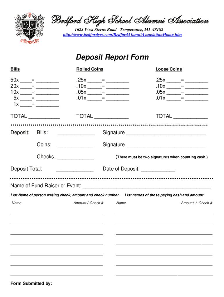 Bedford High School Alumni Association 1623 West Sterns Road Temperance, MI 48182 http://www.bedfordyes.com/BedfordAlumniAssociationHome.htmDeposit Report Form BillsRolled CoinsLoose Coins50x 20x