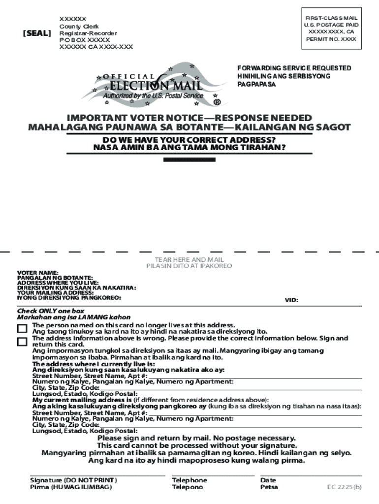 SEAL FIRST-CLASS MAIL U.S. POSTAGE PAID XXXXXXXXX, CA Permits NO. XXXXXXXXXX County Clerk RegistrarRecorder PO BOX XXXIX XXX CA XXXXXXXFORWARDING SERVICE REQUESTED MINIMIZING ANG SERBISYONG PAGPAPASAIMPORTANT
