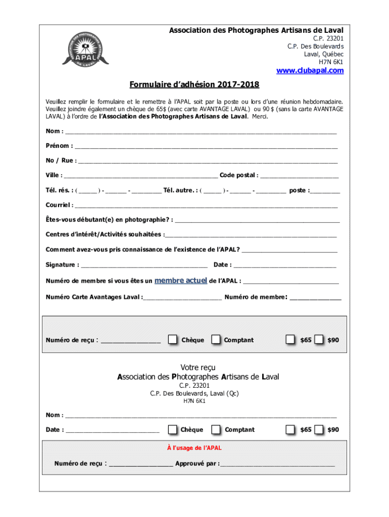 Association DES Photographs Artisans de Laval C.P. 23201 C.P. DES Boulevards Laval, Quebec H7N 6K1www.cubical.comFormulaire adhesion 20172018 Vehicle repair LE formula ire et LE resettle papal soil