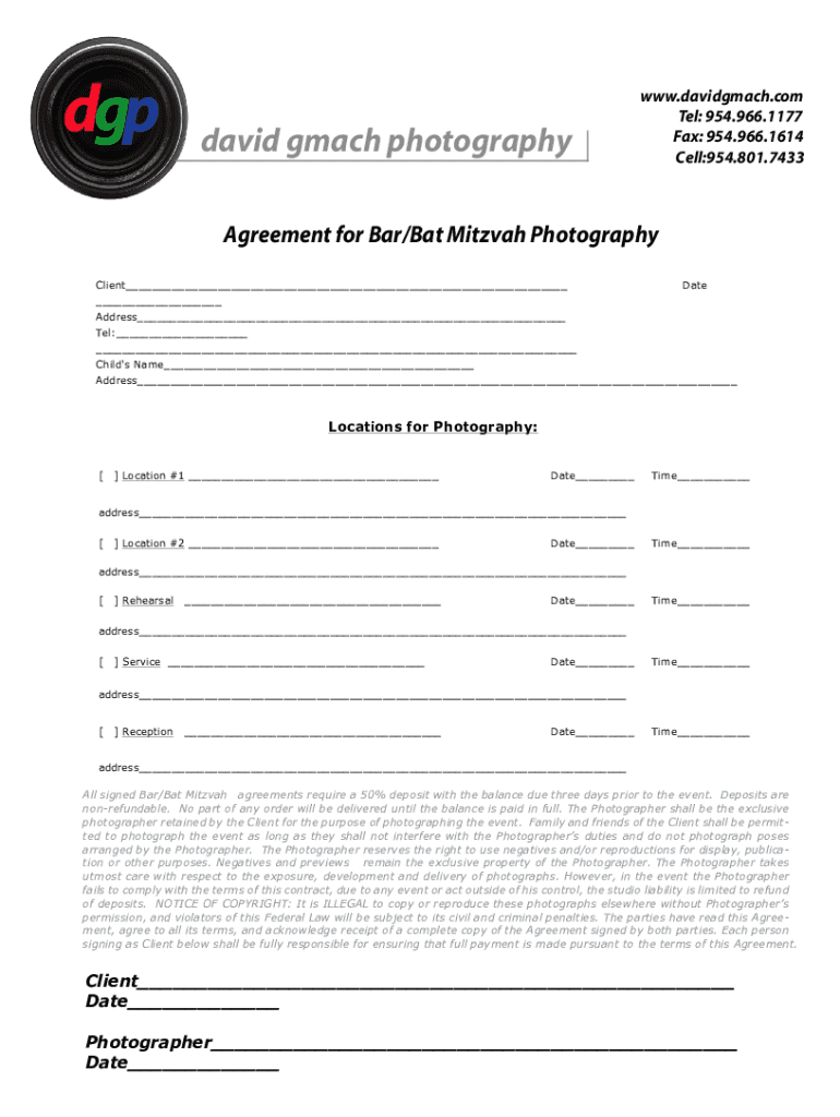 David Mach photography.davidgmach.com Tel: 954.966.1177 Fax: 954.966.1614 Cell:954.801.7433Agreement for Bar/Bat Mitzvah Photography Client Headdress Tel: Child's Name Address Locations for Photography: